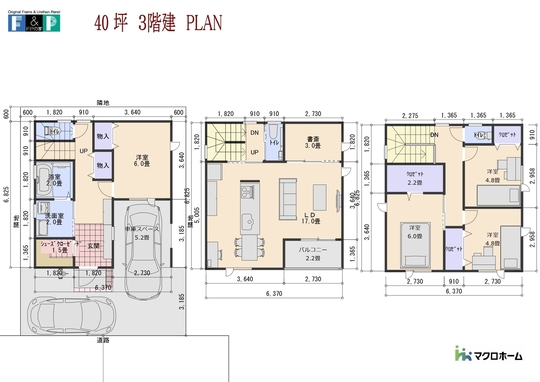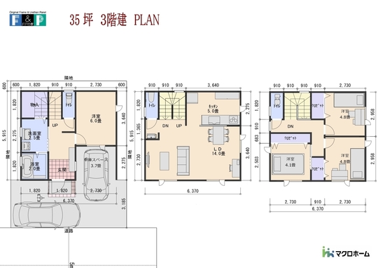 35坪の大きさの3階建ての間取りです。 敷地の間口7.6Mあれば入ります。1階