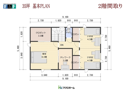 35坪の間取りから子ども部屋を大きく6畳づつ与えたPLANになります。2階床面積16.5坪