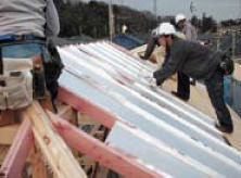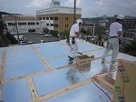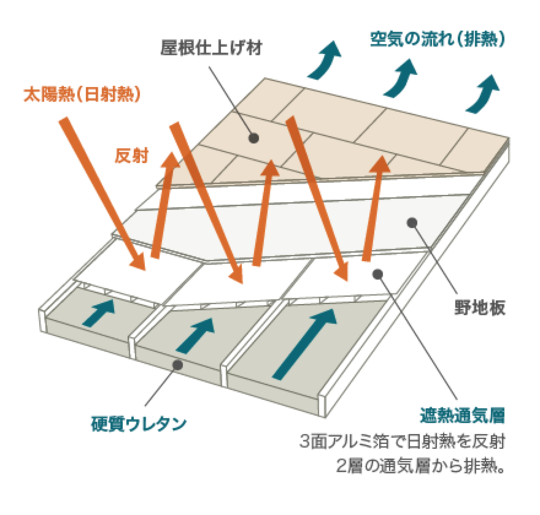 写真はFP屋根遮断パネルの例です。105ミリの熱伝導率0.024のパネルの上に遮熱シートを張って35ミリの隙間から熱を屋根上へ逃がす構造となっています。