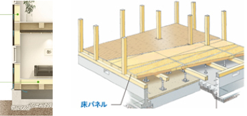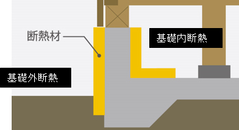 近年床下を利用して基礎下の空気を密閉して基礎内も室温と同じにして基礎空間から1階床を暖める基礎団という工法も増えてきています。(左図:基礎断熱工法)