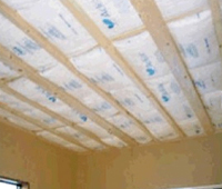 左写真が一般的なグラスウールの天井断熱です。お部屋のすぐ上の野縁と言われる天井ボードの下地材の上に乗せる感じです。