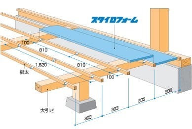 最近では(右図)のように根太ではなく大引間に入れるので10センチや12センチの断熱材空間があるので壁と同じ断熱性能も可能です。