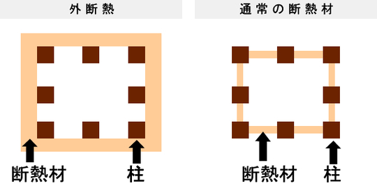これまでは柱間の壁の中に断熱材を入れる工法が一般的でしたが、柱よりも熱伝導率の低い(性能が良い)断熱材で囲う事でより断熱性能を高める事が可能です。