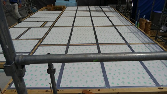 写真中・右はFPの天井パネルです。こちらは野縁より上の梁と呼ばれる構造材に床パネルと同じ感じで木の間にパネルを施工します。