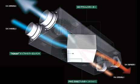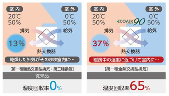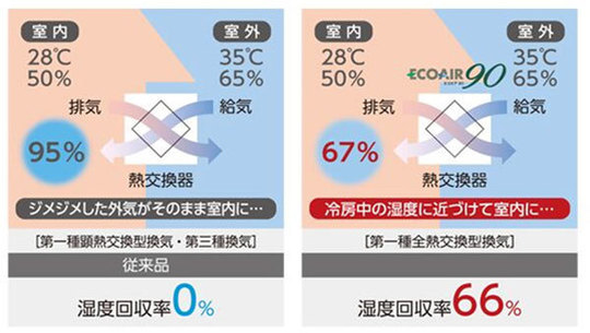 エコエア90は、日本の高温多湿な夏や過乾燥になる冬にも対応できるよう、湿度も改修する「全熱交換型」を採用しました。