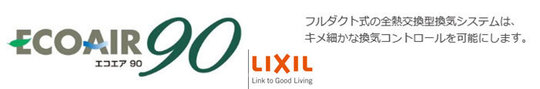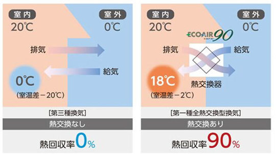 エコエア90は、熱(温度)と湿度の両方を交換する、一般的な顕熱交換型からさらに進化した全熱交換換気システム。
