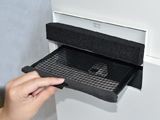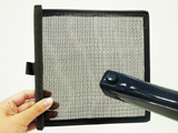本体前面にフィルターが内蔵しており、片手で簡単にフィルターが取り出せます。フィルターは月1回を目安に掃除機で汚れを除去します。汚れがひどい場合はやさしく水洗いするか交換して下さい。