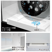 浴室の結露はカビが発生する原因となるので、ピアラでしっかり換気。浴室から吸い込んだ湿気はピアラ本体内で結露水に変わってドレントレーに溜まります。結露水はドレントレーを外して捨てるだけでOKです。