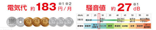 電気代は月に約183円です。DC モーターと独自の羽根形状が、高効率のファン性能を生み出すことで電気代を大幅に削減しています。また、騒音値は約27dBで、スタジオと同じくらいの静けさです。赤ちゃんがいるご家庭でも気にせずご使用いただけます。