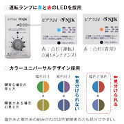 風量無段階変速のボリューム式リモコンです。30日に一度ランプが点灯し、メンテナンスをお知らせします。運転ランプの色が、色覚障害の方も見分けやすい青(寒色系)と赤(暖色系)の色合わせになりました。運転状況やメンテナンスの時期も区別できます。