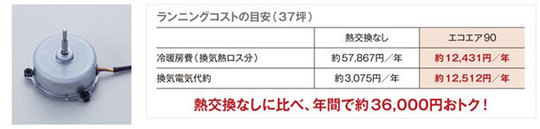エコエア90は、一般的なACモーターと比べて高効率で消費電力の少ないDCモーターを採用。特に24時間換気運転時においては、節電効果が発揮されます。