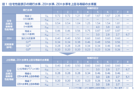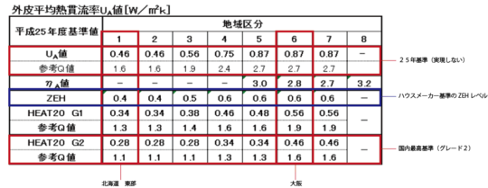 国内最高基準を設定している団体HEAT20はZEHレベルより更に上の断熱性能を目指しています(欧米の基準)上記表にはG1グレード G2グレードの数値が記載されています。