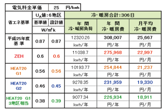 25年基準(0.87)からZEH基準(0.6)では年間3.2万円 月々2,670円の差