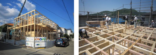 梁は無垢材を使用すると梁の高さが大きくなるので松系(レッドウッド)材料の集成材を使用しています。