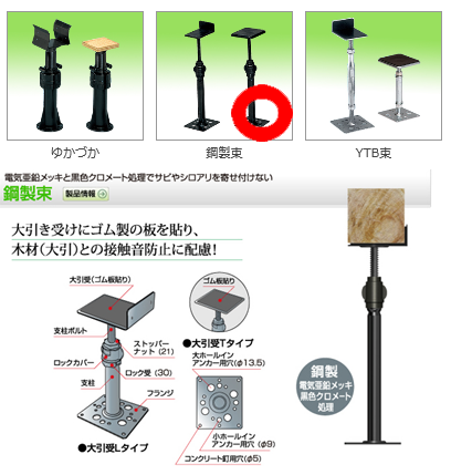 床下で見えない束の種類もさまざまです。マクロホームでは電気亜鉛メッキ及び黒色クロメート処理でサビに強い材料を選んでいます。また、大引(木材)と鋼製束の間にゴム製の板を貼った配慮もしています。