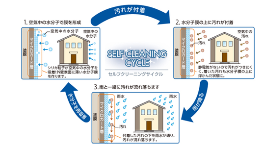 親水性の効果で空気中の水分子を取り込んで外壁表面に薄い水分子膜を作り、汚れを浮かせて、雨で洗い落とします。