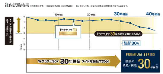 ニチハの「プレミアムシリーズ」は超高耐候「プラチナコート30」を採用し、窯業系サイディング業界初となる「塗膜の変色・褪色30年保証」※1に対応。