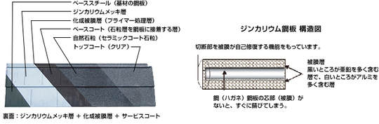 ディーズ ルーフィングは、錆に強いガルバリウム鋼板と同じ組成のジンカリウム鋼板を基材としています。