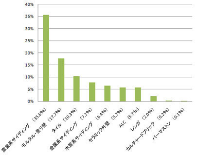 一番多いのが、窯業系サイディング。35.6%の方が選んでいます。工業生産品であるサイディングは、品質が均一なこと、価格や商品バリエーションが豊富なことが特徴。特に窯業系サイディングは、石目調や木目調、レンガ調などデザインも多彩です。メーカーの技術開発により、性能や機能も向上、汚れが付きにくいものやメンテナンスの楽なものなど豊富に揃っています。たとえば、継ぎ目をなくすことで、シーリング処理が不要となり、美観の向上とともに耐久性のアップしたものや超耐候性塗料により美しさが長持ちするもの、光触媒をコーティングすることにより、色あせや汚れが落ちやすくしたものなどもあります。