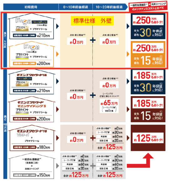 また、「プラチナシール」か「ドライジョイント工法」(Fu-geプレミアムの場合)なら、シーリングの打ち替えの負担も軽減できます。